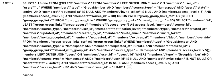 GitLab.com, logs entries with the number of executed cached queries in the pubsub-redis-inf-gprd* index as db_cached_count. You can filter by endpoints that have a large number of executed cached queries. For example, an endpoint with a db_cached_count greater than 100 can indicate an N+1 problem which is masked by cached queries. You should investigate this endpoint further to determine if it is indeed executing duplicated cached queries.